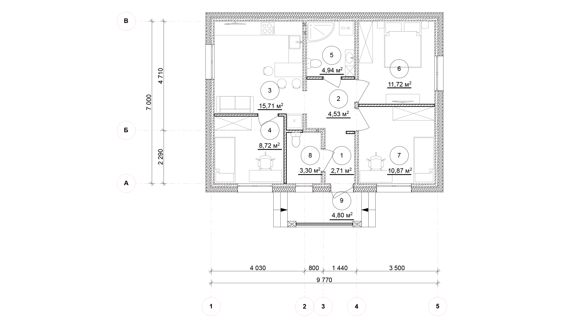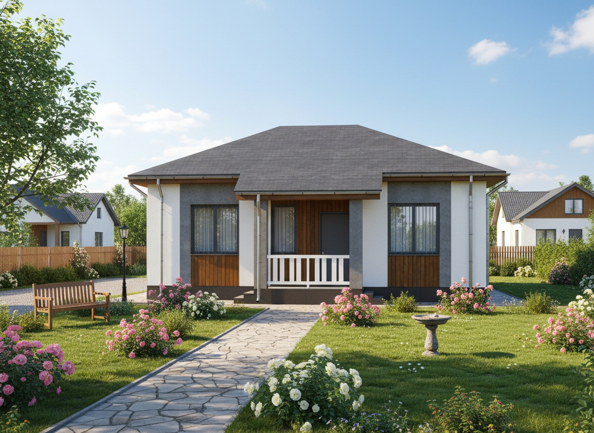 Одноэтажный дом 67 м2. Компактный дом с тремя изолированными спальнями, отдельной гостиной 15,71 м2, просторный холл, ванная 4,94 м2