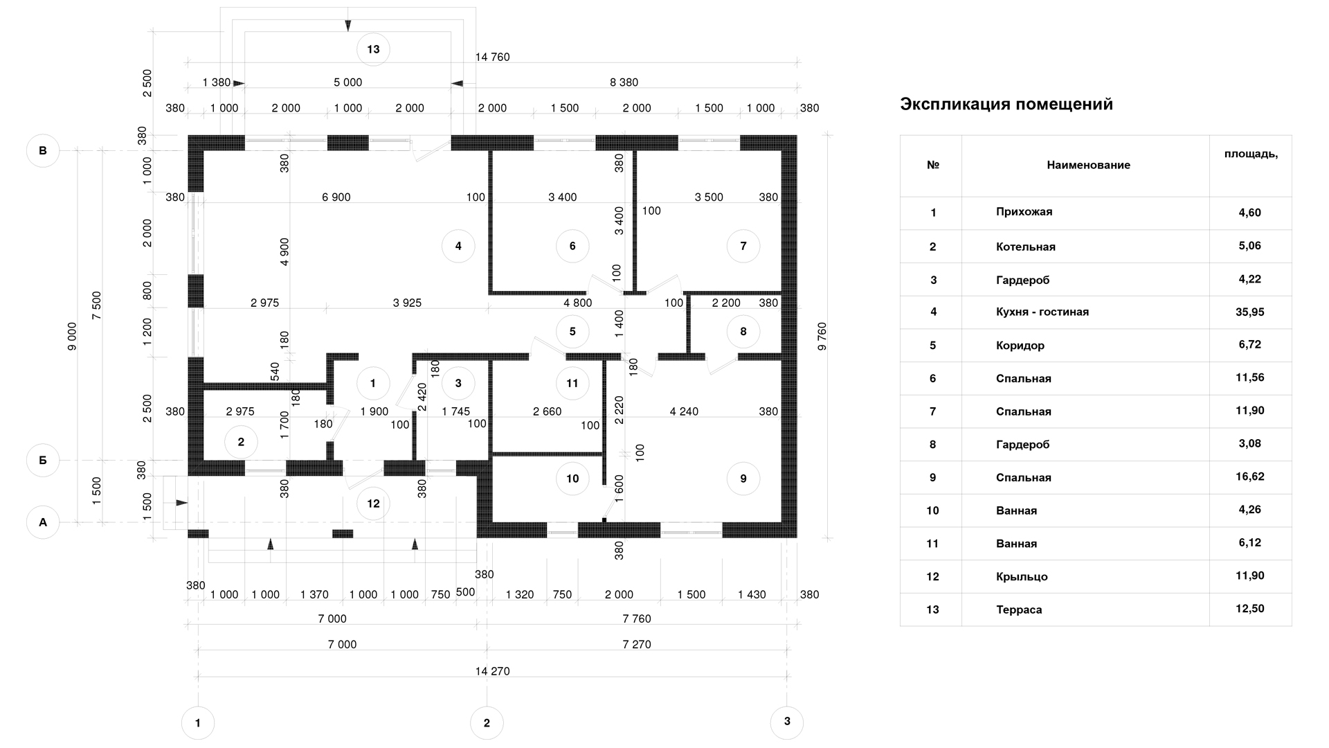 Кухня-гостиная - 37,5 кв.м.; 3 спальные комнаты - 14,8 кв.м., 10,5 кв.м., 10,5 кв.м.; 2 гардеробные - 4,0 и 2,8 кв.м. ; 2 Сан.узла и котельная - 8,0 кв.м., 3,3 кв.м. и 5.8 кв.м.